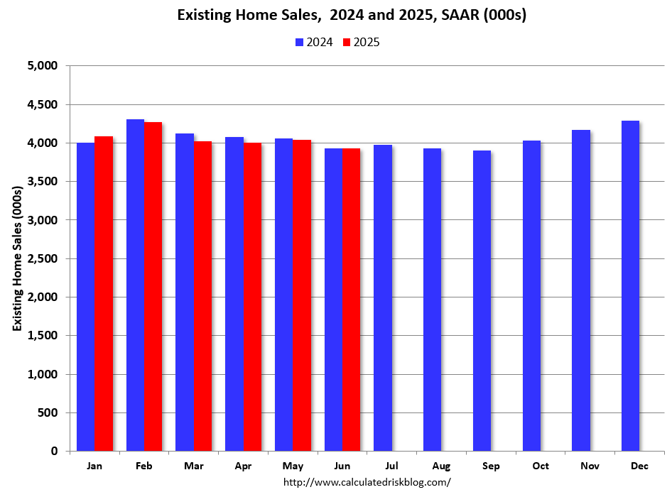 This graph shows existing home sales by month for 2024 and 2025, on a Seasonally Adjusted Annual Rate (SAAR) basis. Last year, the NAR reported sales in July 2024 were at 3.98 million SAAR.