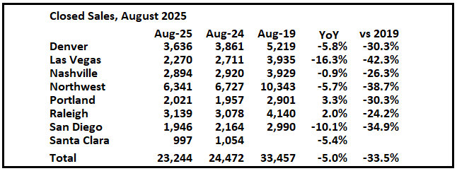 In August, sales in these early reporting markets were down 5.0% YoY. Last month, in July, these same markets were up 0.5% year-over-year Not Seasonally Adjusted (NSA).