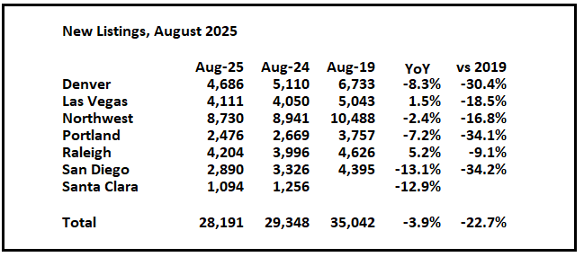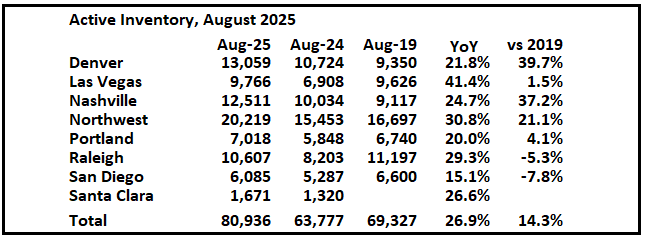 Comparing to August 2019, inventory is up sharply in Denver and Nashville and down in San Diego. There are significant regional differences in inventory.