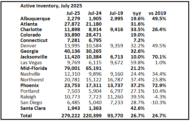Comparing to July 2019, inventory is up sharply in Jacksonville and Phoenix and down in San Diego. There are significant regional differences in inventory.