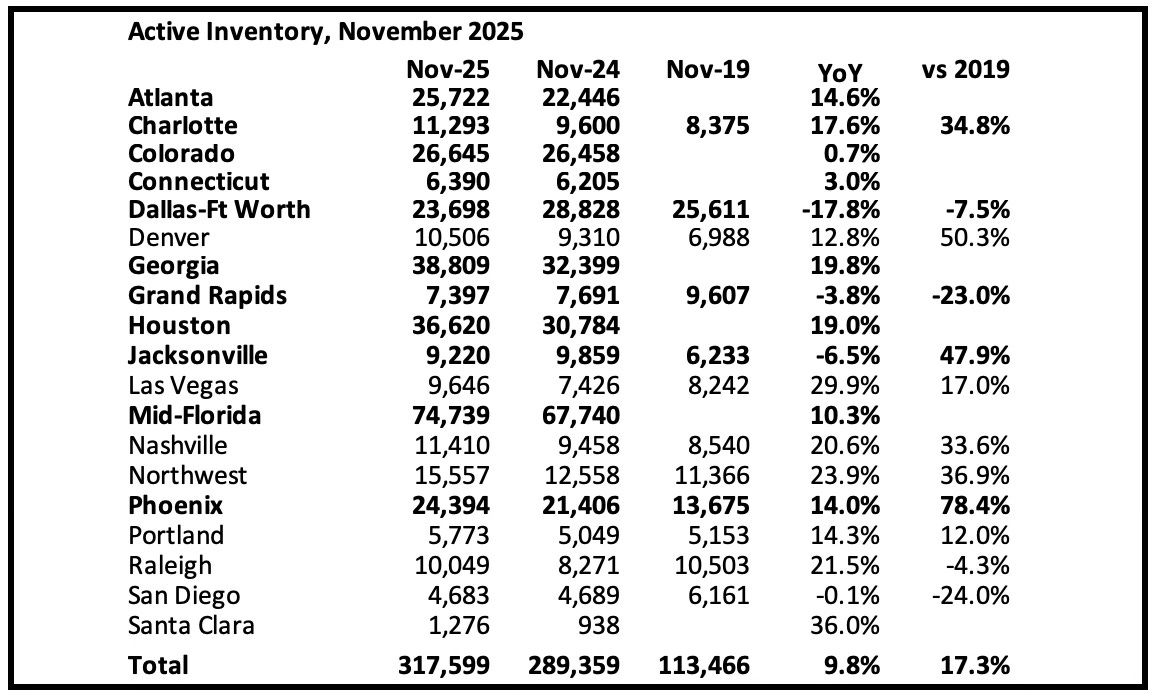 Comparing to October 2019, inventory is up sharply in Denver and Phoenix, and down in Grand Rapids and San Diego. There are significant regional differences in inventory.