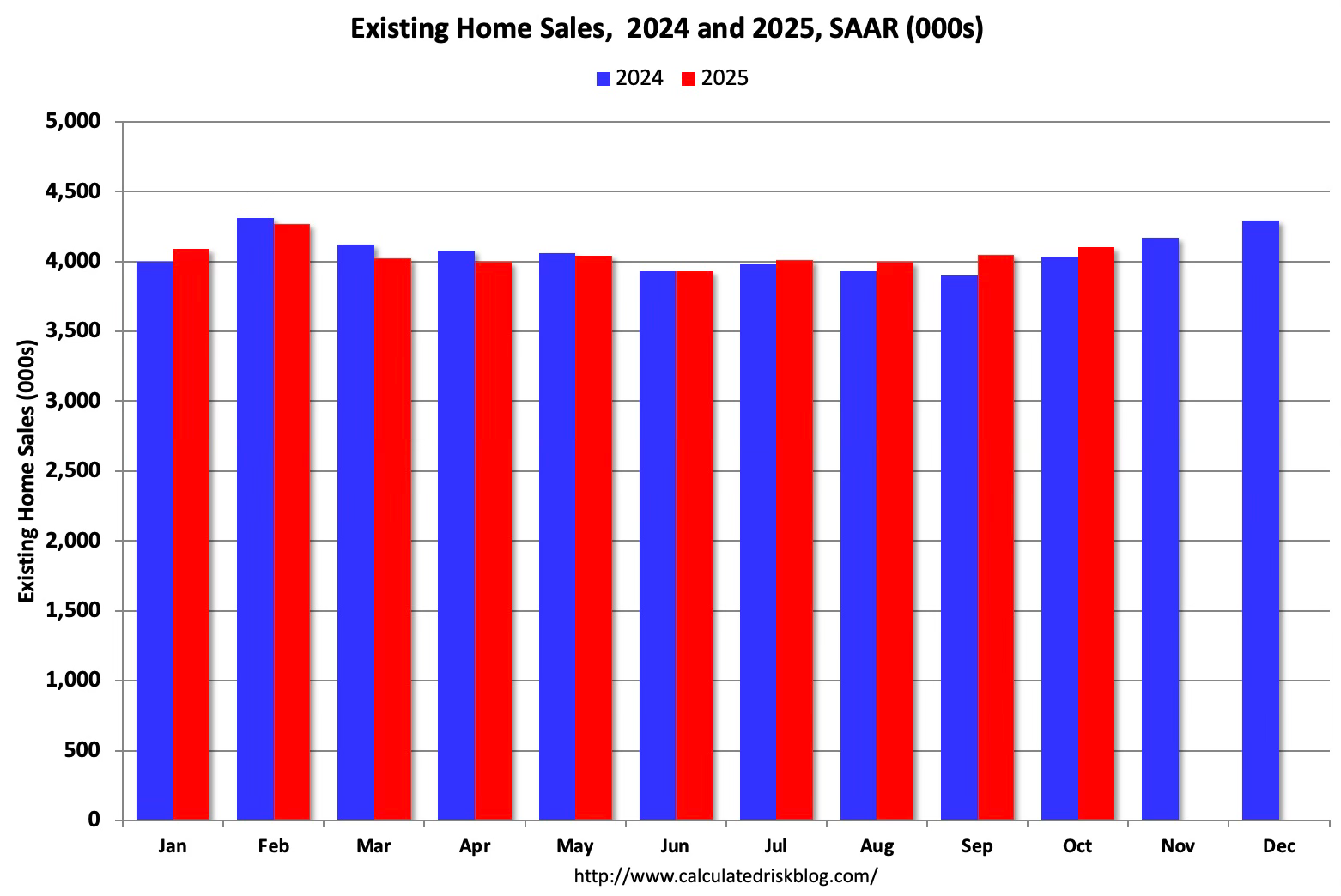 This graph shows existing home sales by month for 2024 and 2025, on a Seasonally Adjusted Annual Rate (SAAR) basis. Last year, the NAR reported sales in November 2024 were at 4.17 million SAAR.