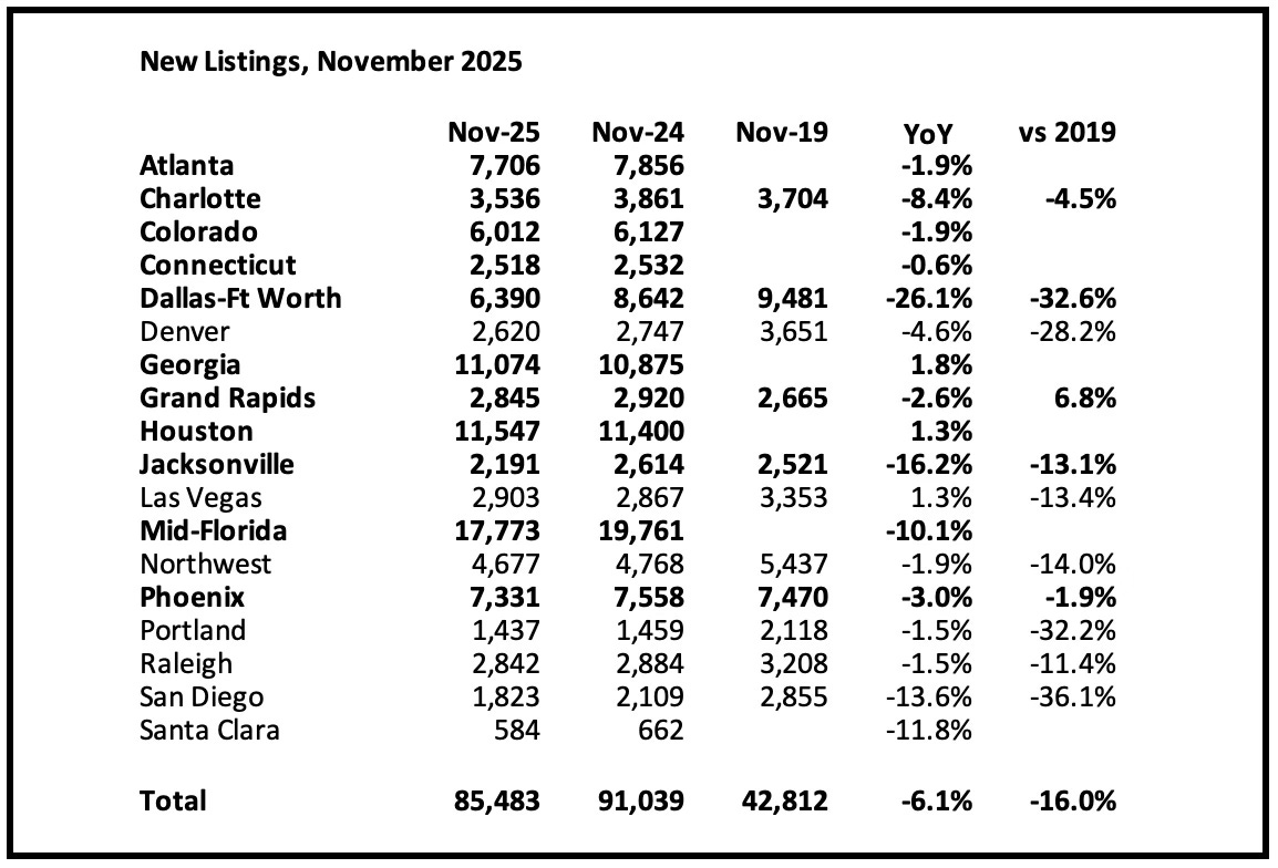 New listings are still down 16% compared to October 2019 activity for these markets.