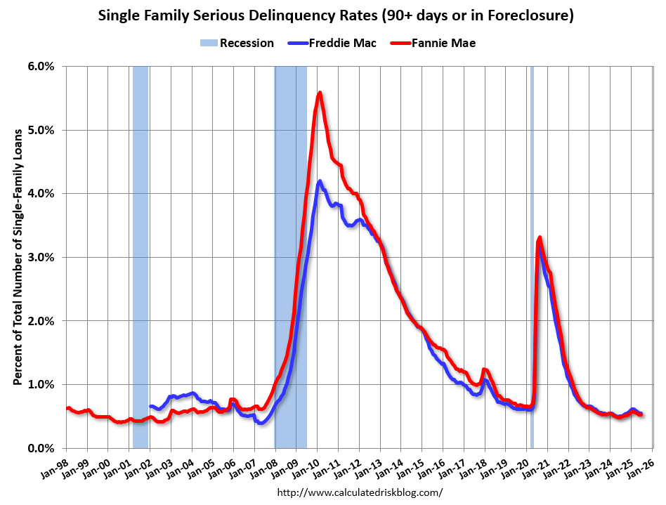 For recent loans, originated in 2009 through 2025 (98% of portfolio), 0.48% are seriously delinquent (down from 0.49%). So, Fannie is still working through a handful of poor performing loans from the bubble years.