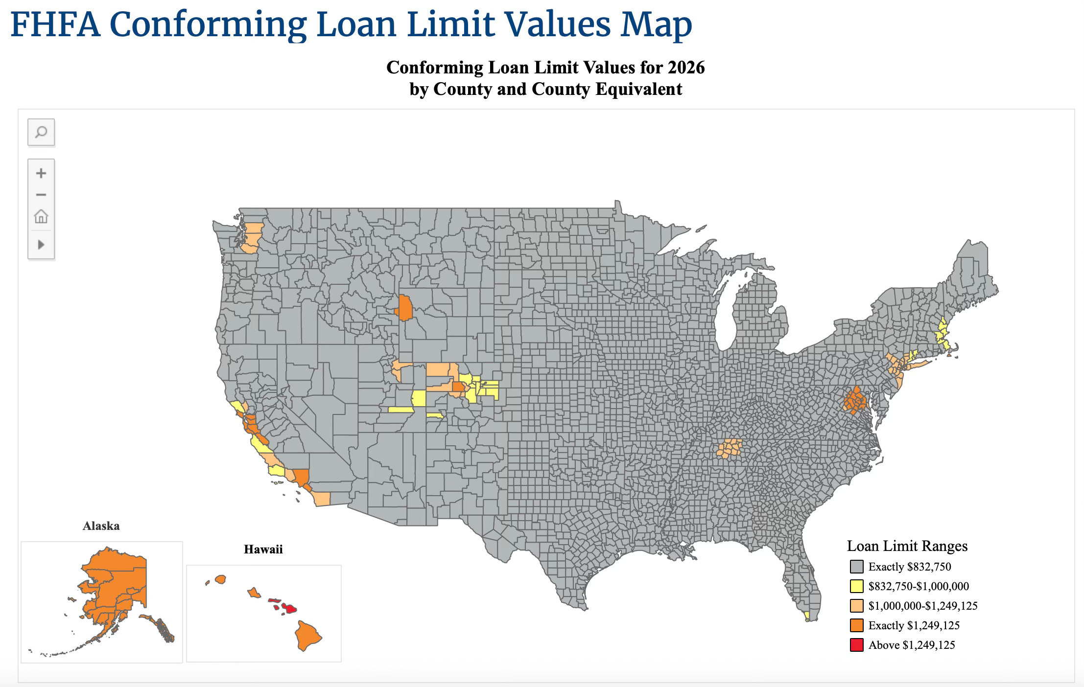 U.S. Federal Housing (FHFA) today announced the conforming loan limit values (CLLs) for mortgages Fannie Mae and Freddie Mac (the Enterprises) will acquire in 2026. In most of the United States, the 2026 CLL value for one-unit properties will be $832,750, an increase of $26,250 from 2025. ….