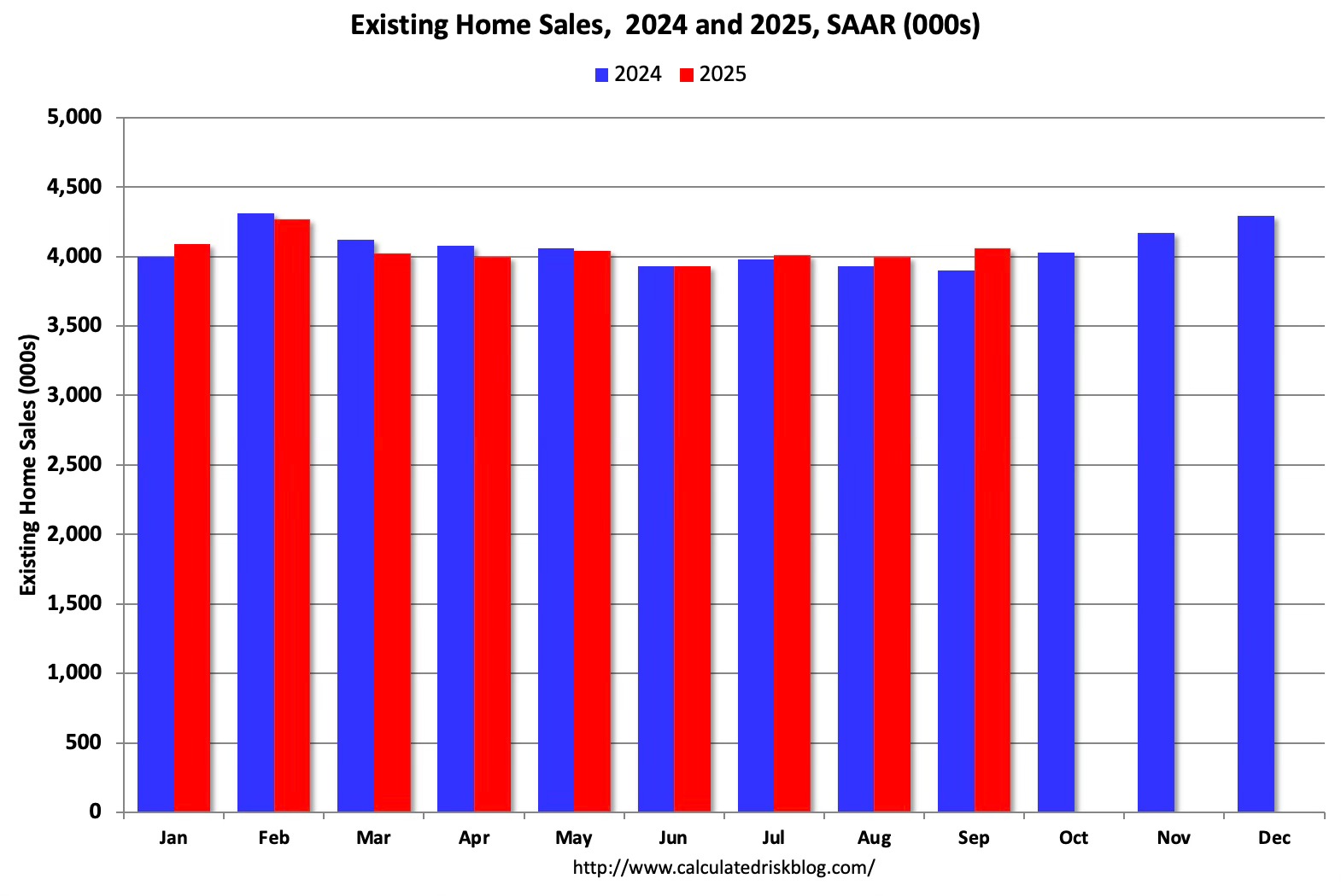 My early expectation is that we will see existing home sales (SA) up slightly in October compared to October 2024 (4.03 million SAAR). The comparison will be fairly easy.
