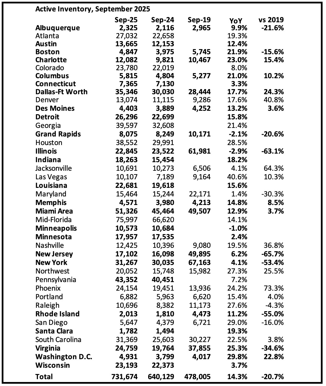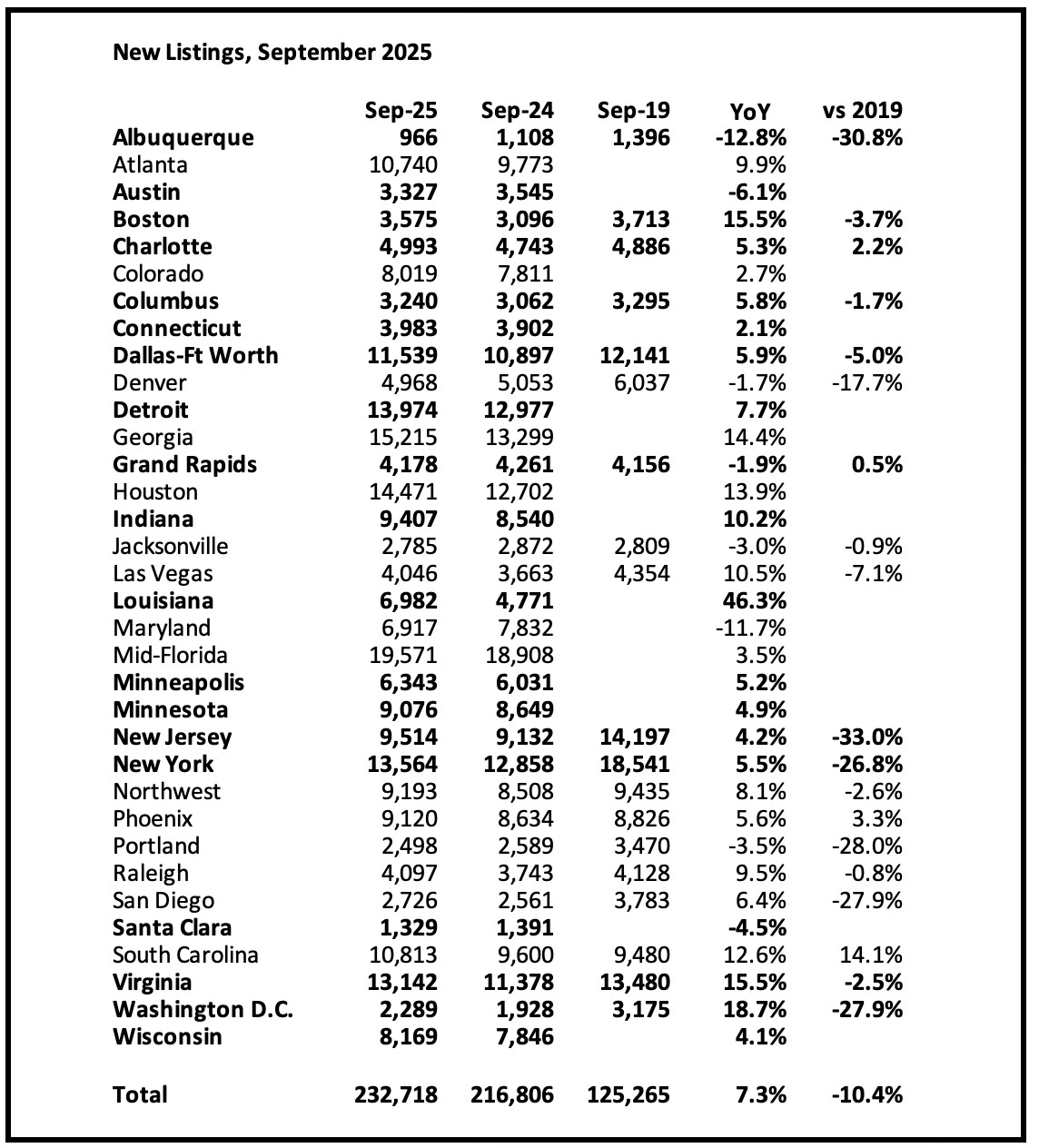 New listings are still down 10% compared to 2019 activity for these markets.