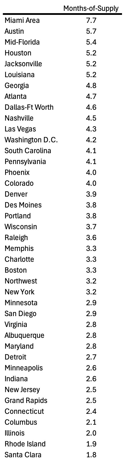 Here is a look at months-of-supply using NSA sales. Areas in Florida and Texas - with high levels of months-of-supply - are seeing price declines.