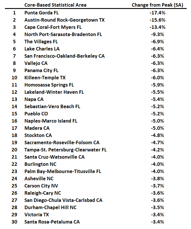 Here are the 30 cities with the largest declines from the peak, seasonally adjusted. Punta Gorda has passed Austin as the worst performing city. Note that 4 of the 5 cities with the largest price declines are in Florida. And 11 of the 30 cities are in Florida.