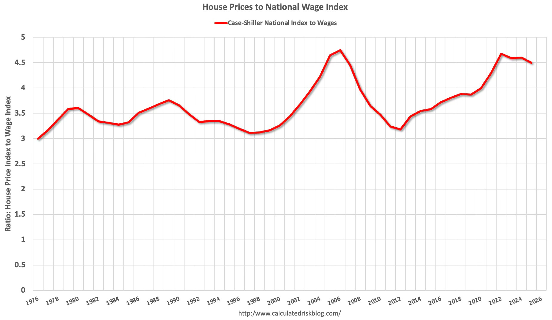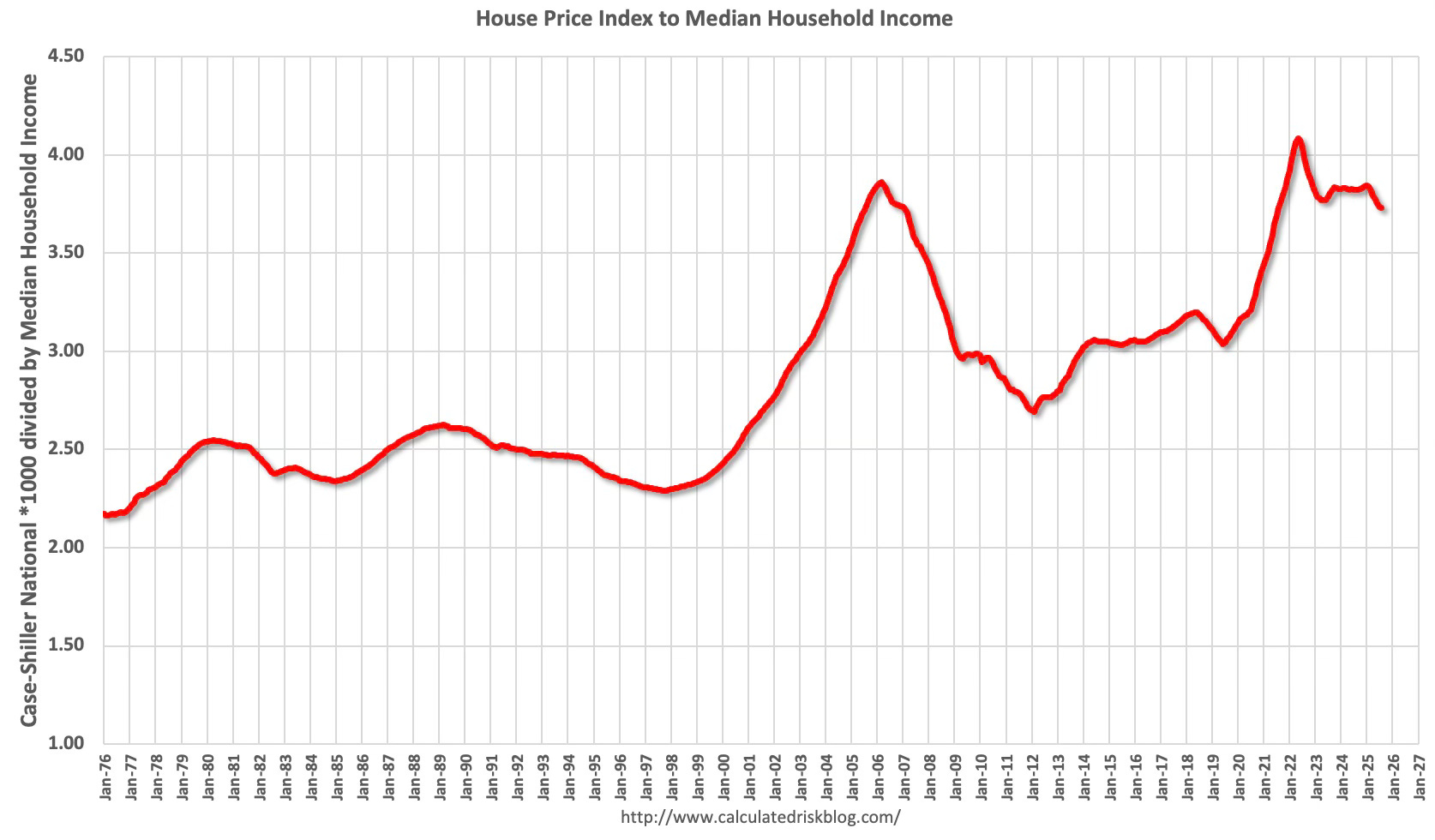 This graph uses the year end Case-Shiller house price index - and the nominal median household income through 2024 from the Census Bureau. 2025 median income is estimated at a 4% annual gain.