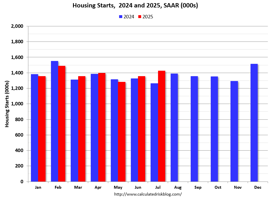 Privately-owned housing starts in July were at a seasonally adjusted annual rate of 1,428,000. This is 5.2 percent above the revised June estimate of 1,358,000 and is 12.9 percent above the July 2024 rate of 1,265,000. Single-family housing starts in July were at a rate of 939,000; this is 2.8 percent above the revised June figure of 913,000. The July rate for units in buildings with five units or more was 470,000.