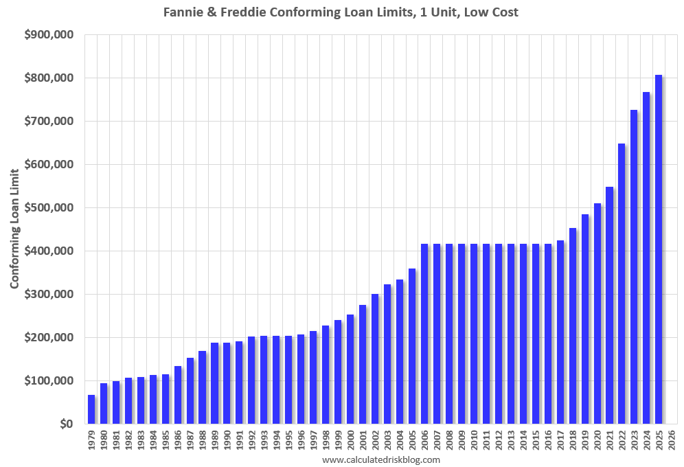 Based on the current year-over-year house price change (through May), the CLL would be close to $830,000 in 2025. For high-cost areas like Los Angeles, the limit could increase to around $1.24 million. However, the year-over-year (YoY) increase in house prices has been slowing, and it is likely the increase will be less than 2.8%. Most likely the CLL will only increase slightly in 2026.