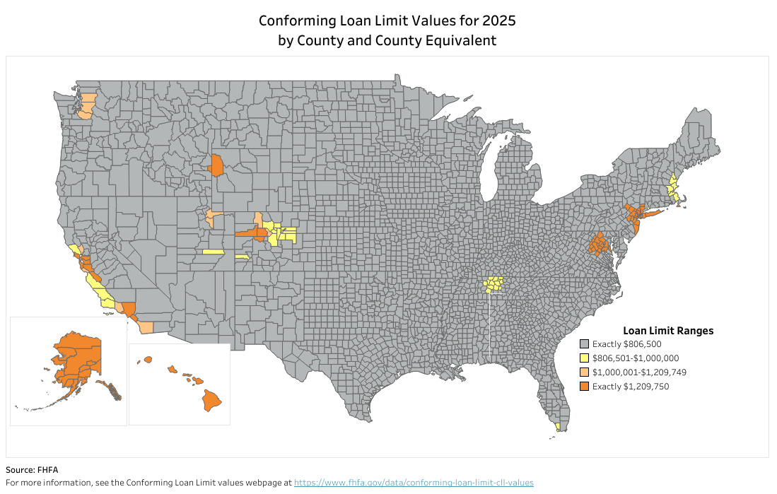 What about FHA insured loans? From the FHA for 2025: One Unit, $524,225 Low-Cost Areas (65% of CLL), and $1,209,750 for high-cost areas. The limit varies by geographical area (based on average house prices).