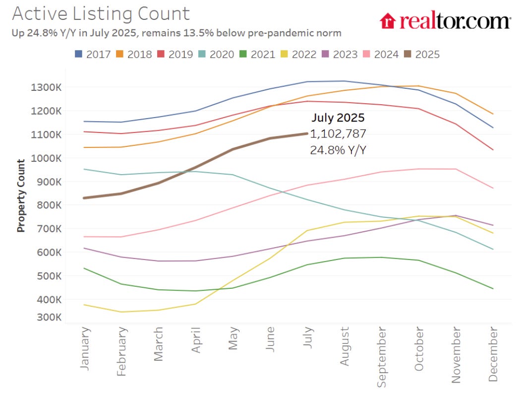 Realtor.com reports in the July 2025 Monthly Housing Market Trends Report that new listings were up 7.3% year-over-year in July. And active listings were up 24.8% year-over-year.