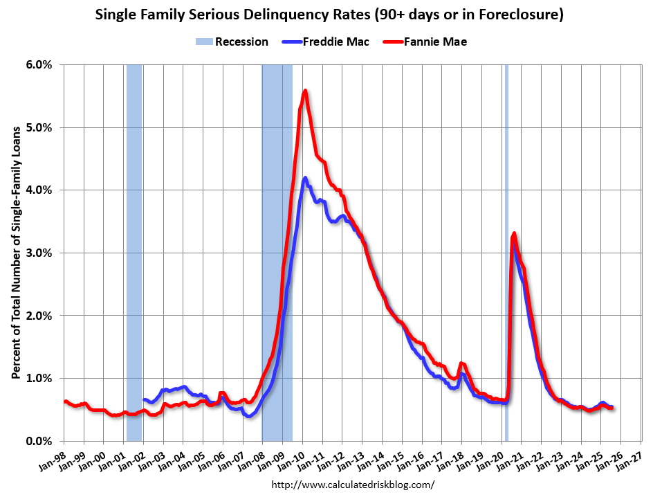These are mortgage loans that are "three monthly payments or more past due or in foreclosure". The pandemic related increase in serious delinquencies was very different from the increase in delinquencies following the housing bubble. Lending standards have been fairly solid over the last decade, and most of these homeowners have equity in their homes - and they have been able to restructure their loans once they were employed.