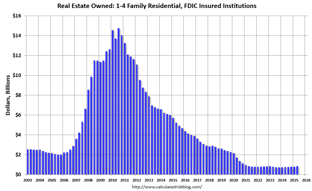 The dollar value of 1-4 family residential Real Estate Owned (REOs, foreclosure houses) was up 15% YOY from $766 million in Q2 2024 to $852 million in Q2 2025. This is still historically extremely low.
