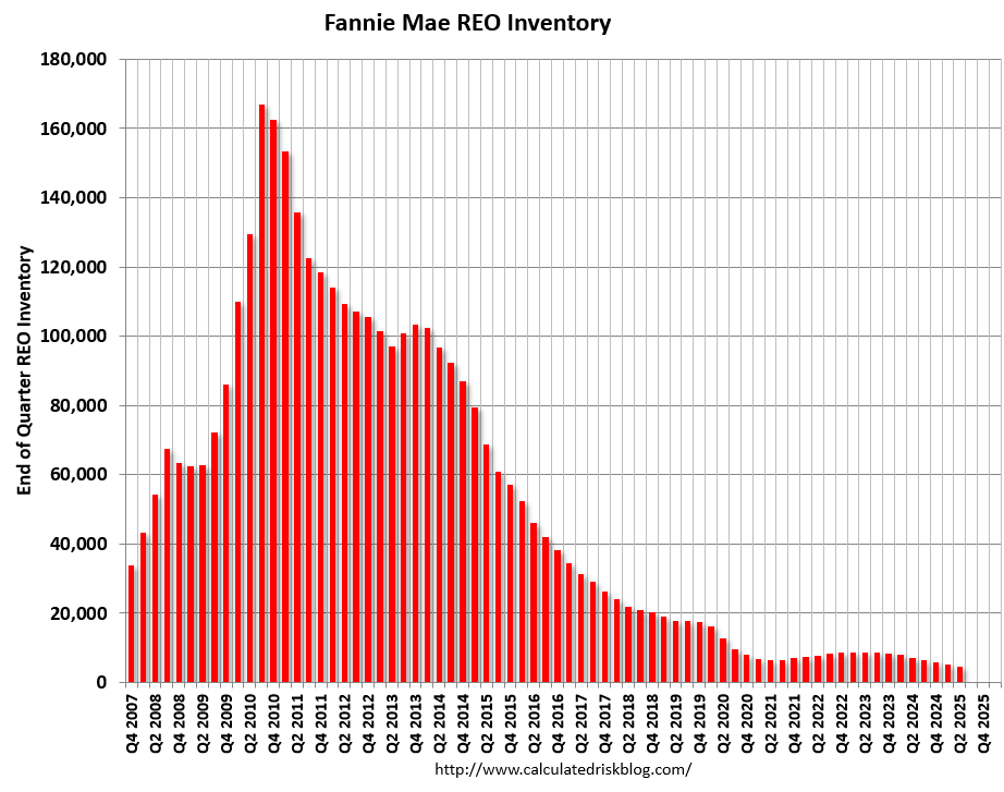 Fannie Mae reported the number of REOs decreased to 4,666 at the end of Q2 2025, down 11% from 5,236 at the end of the previous quarter, and down 35% year-over-year from 7,179 in Q2 2024. Here is a graph of Fannie Real Estate Owned (REO).