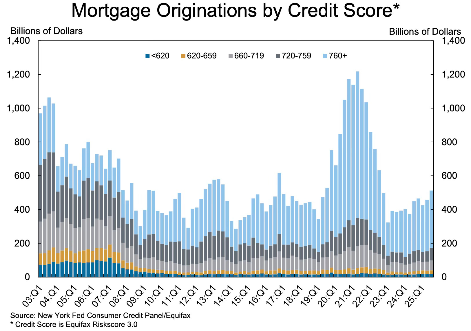 The volume of mortgage originations, measured as appearances of new mortgages on consumer credit reports and including both refinance and purchase originations, increased slightly with $512 billion newly originated in 2025Q3, an uptick from the $458 billion seen in the previous quarter. …